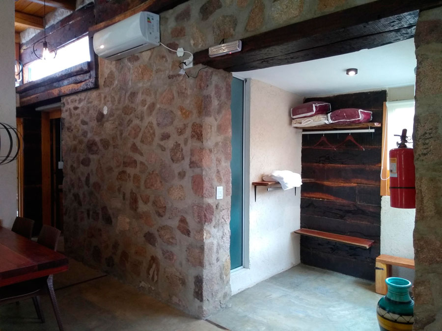 Cabaña con una habitación con sommier de 1.60, aire frío y calor, puerta establo, y en el living con dos sommier de plaza y media con aire frío y calor, ventilador de techo, Smart tv 32",vestidor, mesa con sillas, baño completo y amplio con grifería de primera calidad, ducha amplia con mampara de vidrio, puerta estilo establo, cocina totalmente equipada con horno eléctrico, dos anafes eléctricos, pava eléctrica, tostadora eléctrica, licuadora, cafetera electrica, heladera. Utensilios completos. Cortinas black out textil en todas las ventanas.
