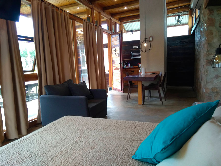 Cabaña con una habitación con sommier de 1.60, aire frío y calor, puerta establo, y en el living con dos sommier de plaza y media con aire frío y calor, ventilador de techo, Smart tv 32",vestidor, mesa con sillas, baño completo y amplio con grifería de primera calidad, ducha amplia con mampara de vidrio, puerta estilo establo, cocina totalmente equipada con horno eléctrico, dos anafes eléctricos, pava eléctrica, tostadora eléctrica, licuadora, cafetera electrica, heladera. Utensilios completos. Cortinas black out textil en todas las ventanas.